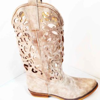 Esta bonita bota de piel, adornos troquelados y flecos muy estilo country. De buena presencia y comodidad.